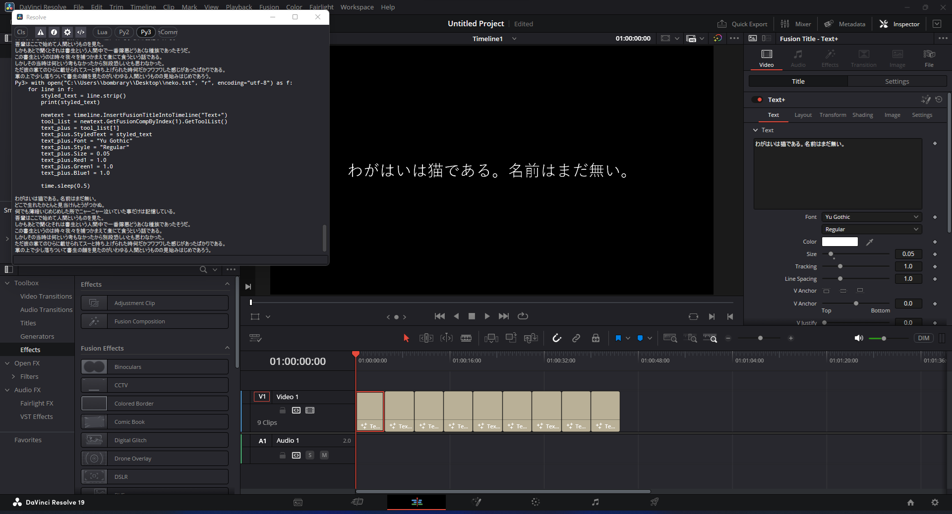 DaVinci ResolveとPythonを使って、テキストを自動挿入する方法を作った。ある程度は単純作業が簡略化できてうれしい。
