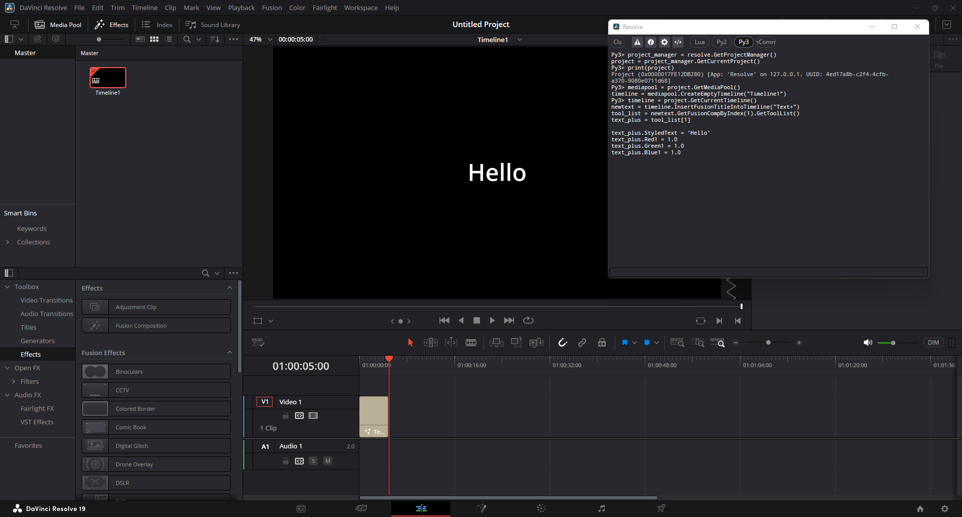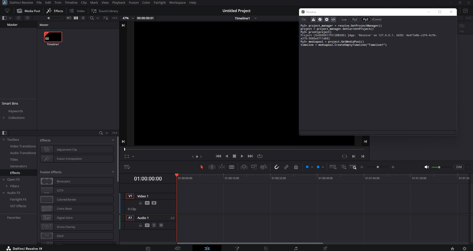 timeline = mediapool.CreateEmptyTimeline("Timeline1")