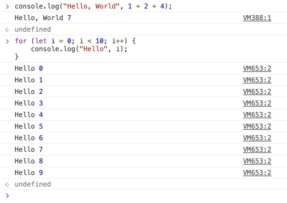 実はDevToolsのConsoleタブからプログラムを実行できます。 Enterを押すと式を実行、Shift+Enterで改行になります。