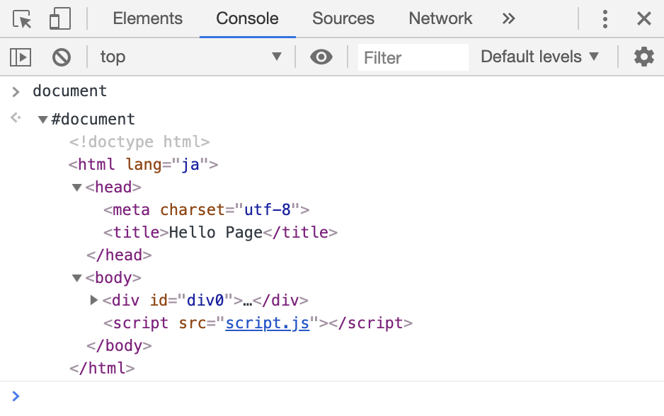 試しにConsoleでdocumentと打ってみましょう。するとhtmlの構造が見えます。