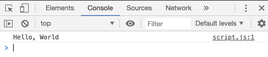 DevToolsのConsoleタブを開くと、Hello, Worldが出力されています。